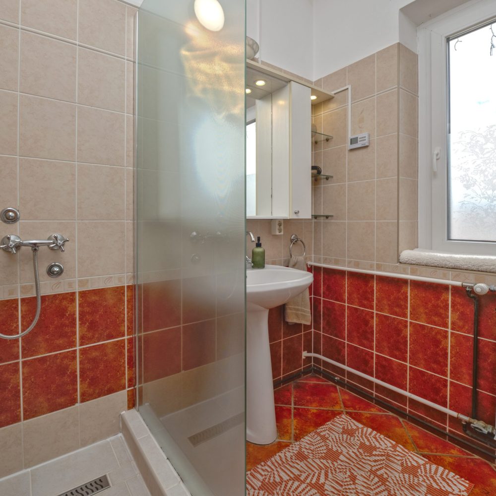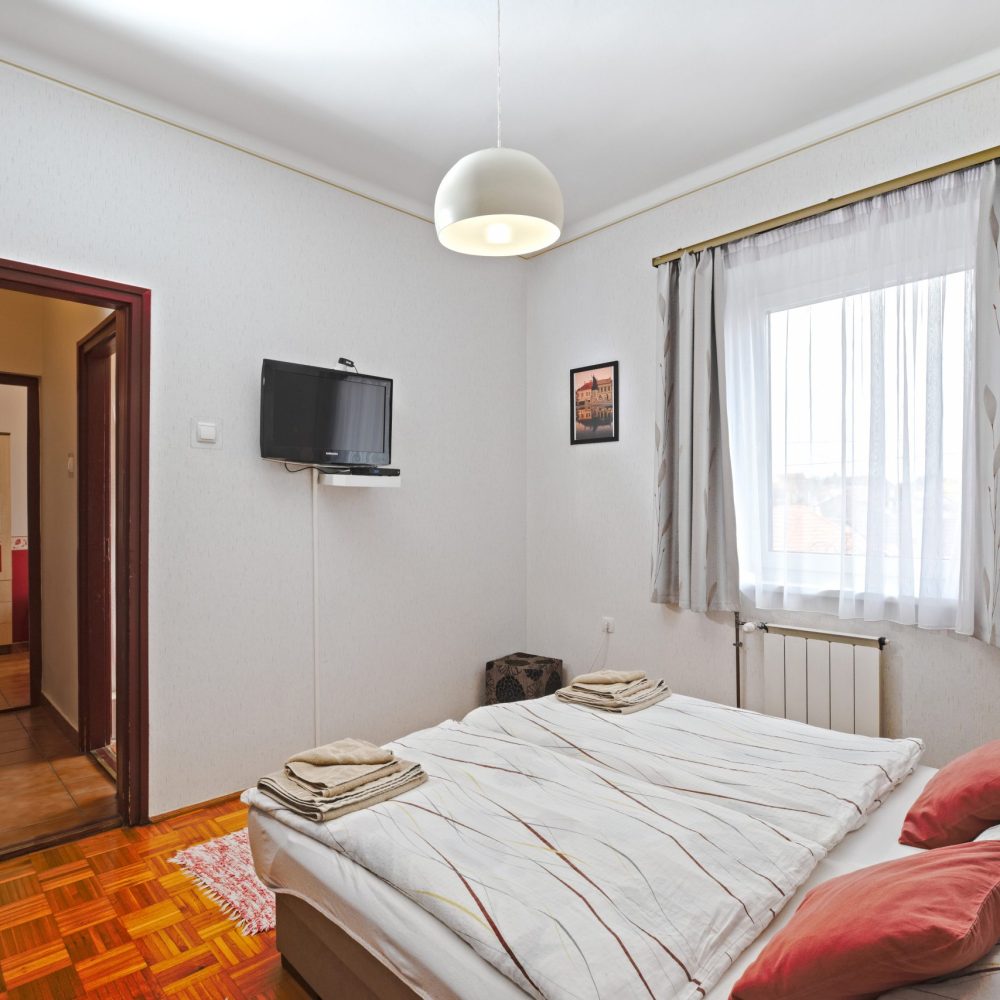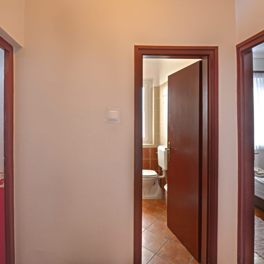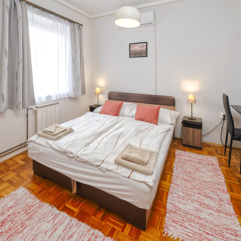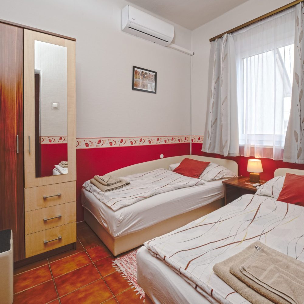 A középső szinten található két hálóteres apartman saját, zuhanyzós fürdőszobával rendelkezik. A „szülői” hálóban franciaágy, LCD TV található, a kis szobában az ágyak igény szerint összetolhatók. Az előtérben minibár hűtő áll a vendégek rendelkezésére. Családok részére ideális, illetve két pár is kényelmesen elfér. A nagyobb szoba pótágyazható, vagy babaágy igényelhető. Padlófűtéses apartman, nyáron klíma biztosítja a kellemes hőmérsékletet. A szinten található egy teljesen felszerelt közös konyha és az étkező.LCD
